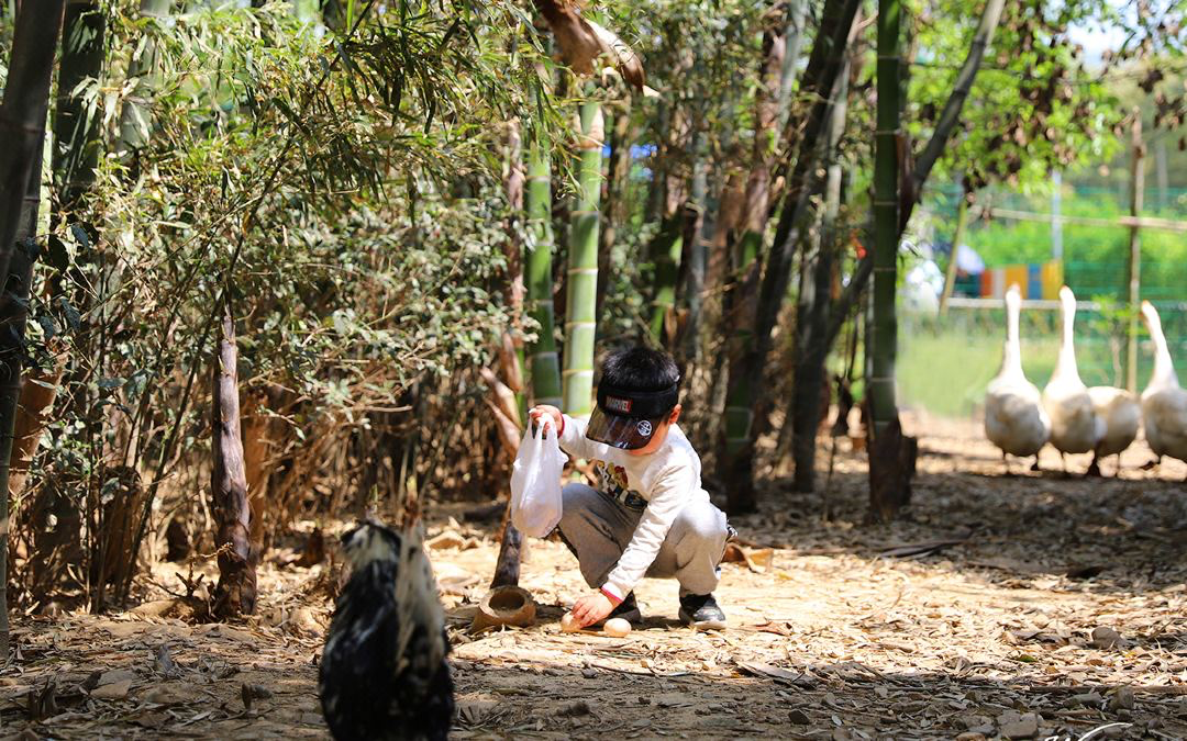 周围是大片的茶山和竹林,满眼的绿色。还可以在牧场喂小动物、竹林摸鸡蛋,还可以骑马、开卡丁车,可以和小朋友一起亲近大自然。