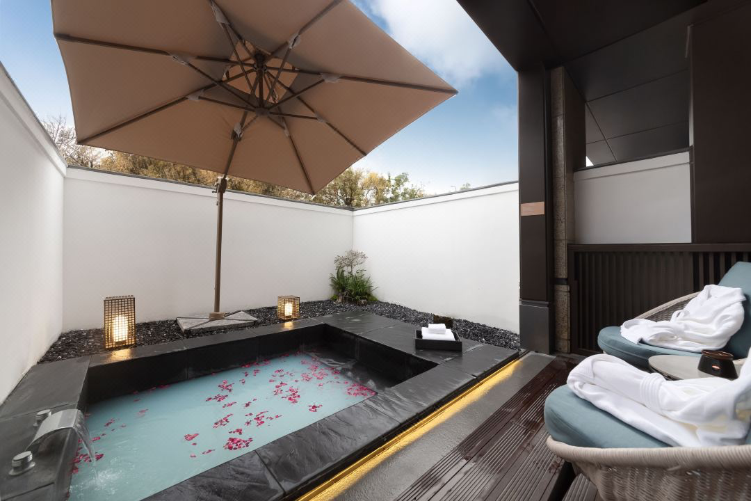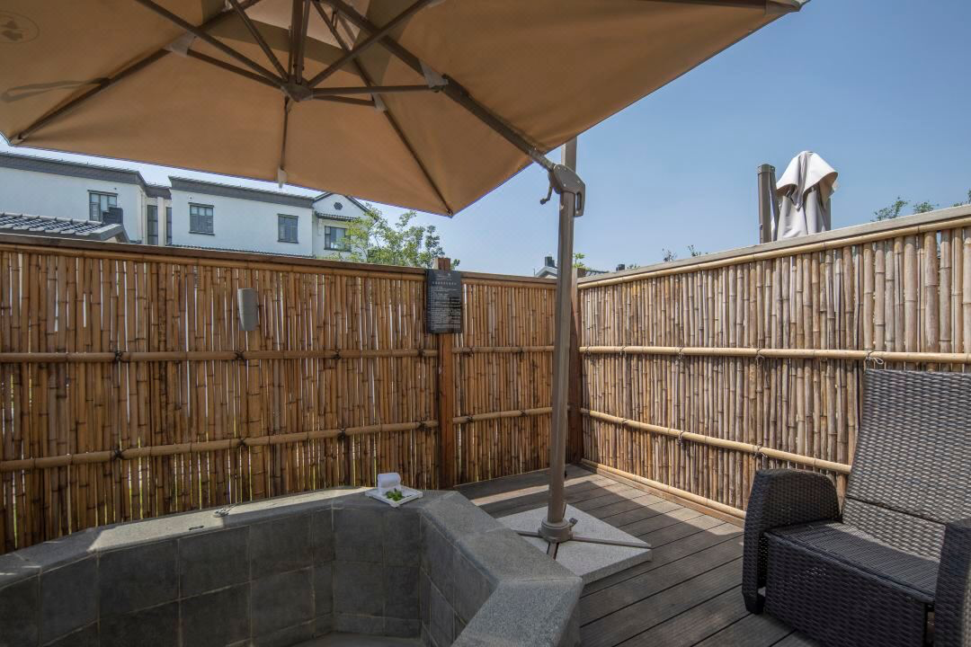禾墅私汤房有个篱笆围起来的精致小院子,可以在院子里泡汤。 冬天温泉不加价,周边的同学可以囤。
