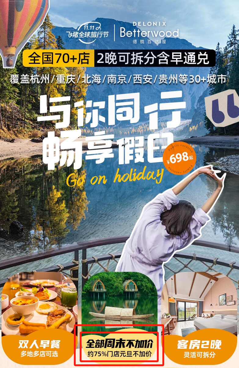客房2晚可拆分+双早,698/798元。周末不加价,部分门店元旦、春节不加价。
