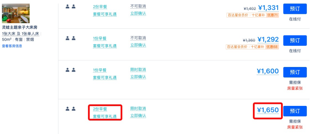 带双早的日历房价要1600+/晚,套餐仅55折,周末不加价。