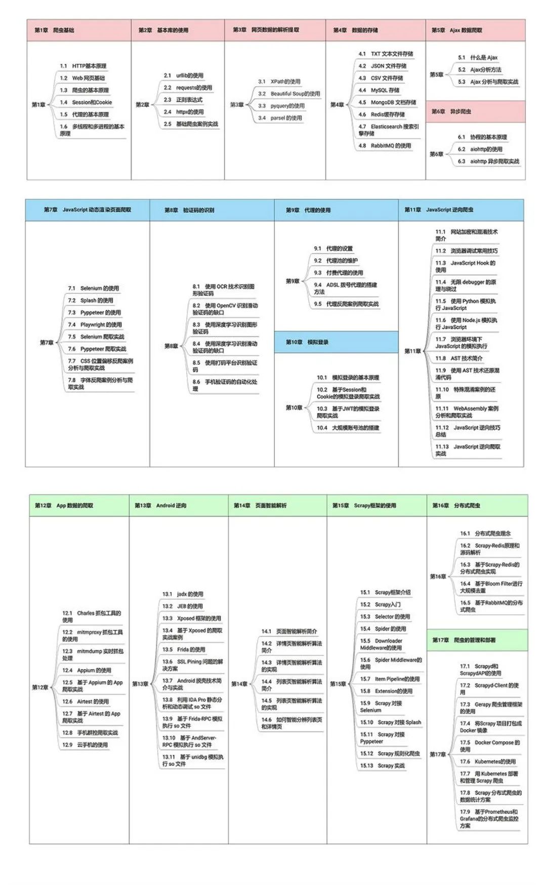 另外,新版内容还增加了异步爬虫、JavaScript 逆向、App 逆向、页面智能解析、深度学习识别验证码、Kubernetes 运维及部署等知识点,同时也对各个爬虫知识点涉及的请求、存储、解析、测试等工具进行了丰富和更新。