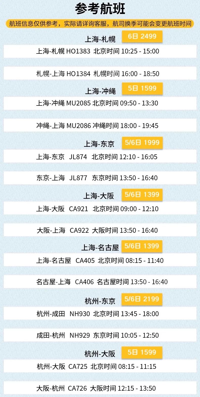上海/杭州 往返 东京/大阪/北海道/名古屋 9:00