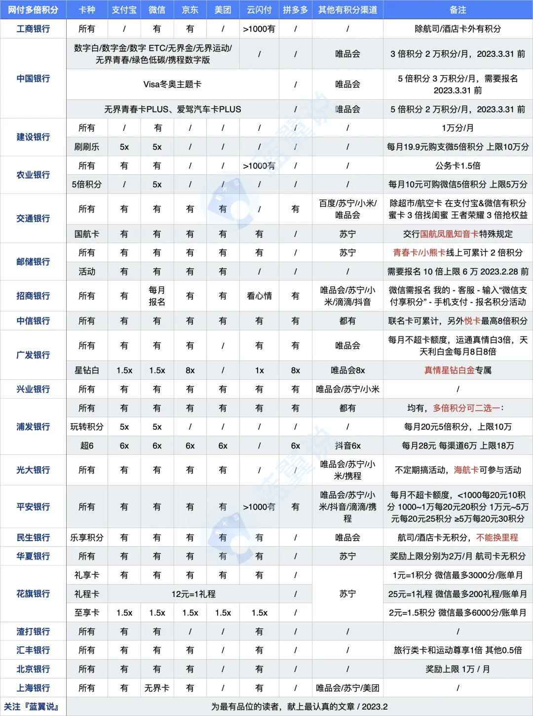 春天来了,春天来了!不少朋友都开始规划出游行程,而银行的活动也开始复苏啦。上周蓝翼更新了,故此后台有读者问:在线积分的总结有没有?那么今天就趁热打铁,更新下信用卡积分政策吧。