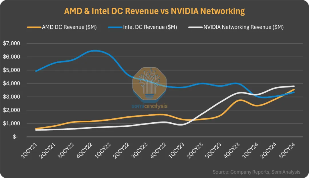 - 英特尔和AMD面临着来自英伟达的竞争,英伟达的数据中心GPU和网络芯片收入远高于两家公司的数据中心硬件销售总额。