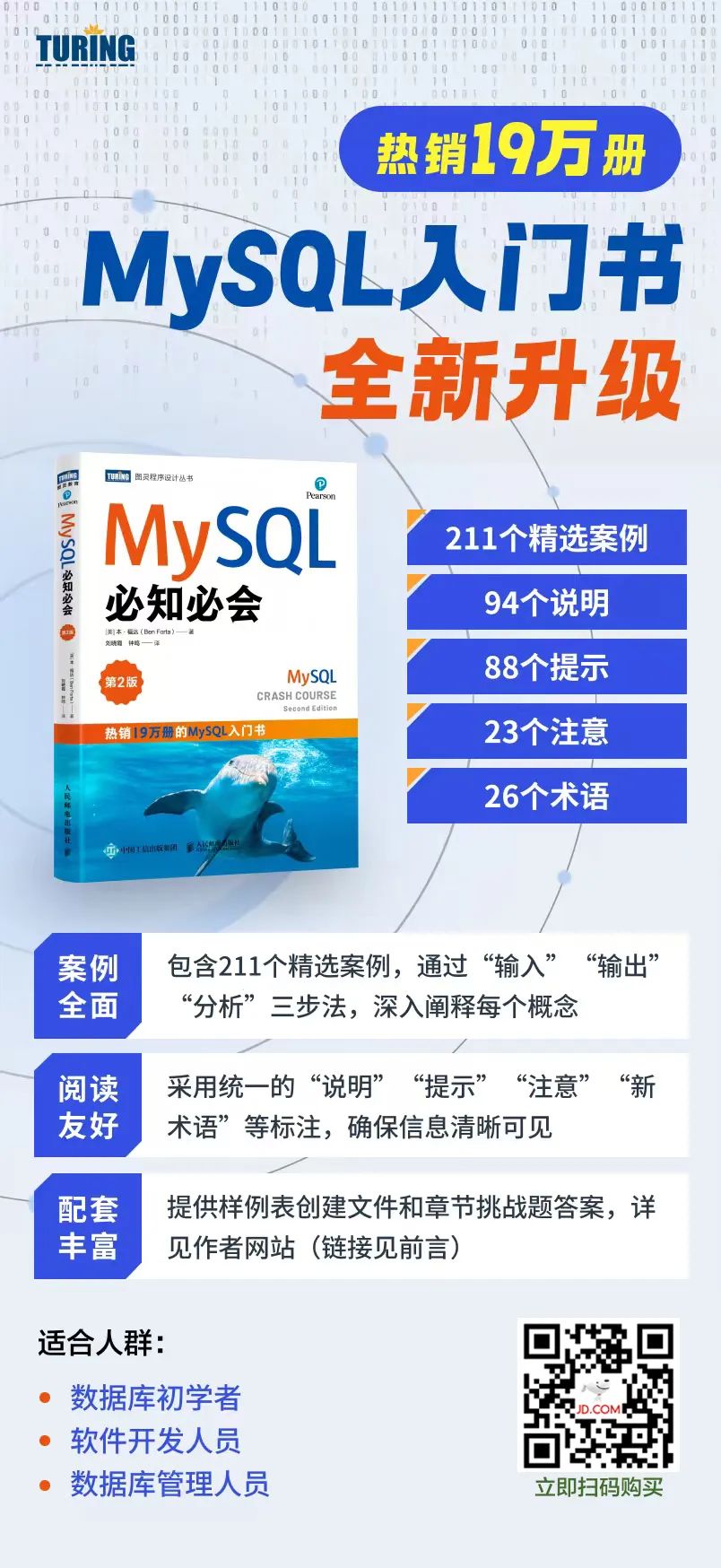全书260页,内容充实,通过211个精选案例,深入阐释每个概念,十分适合初学者、以及需要快速上手MySQL的人群。
