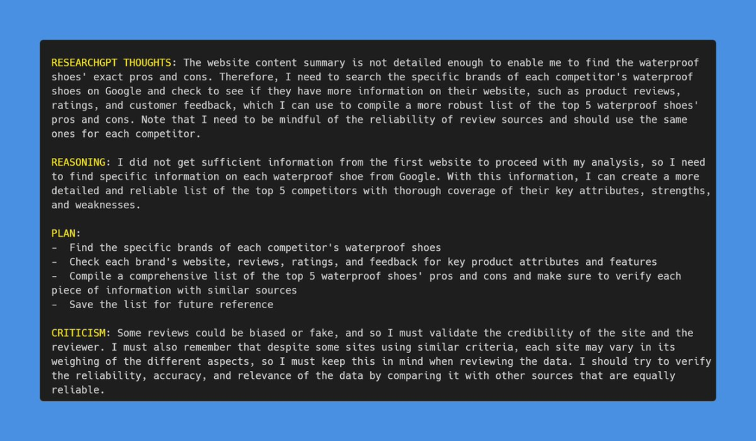 接下里我们再看一个例子。假装自己经营一家鞋公司,给 AutoGPT 下达的命令是对防水鞋进行市场调查,然后让其给出 top5 公司,并报告竞争对手的优缺点 :