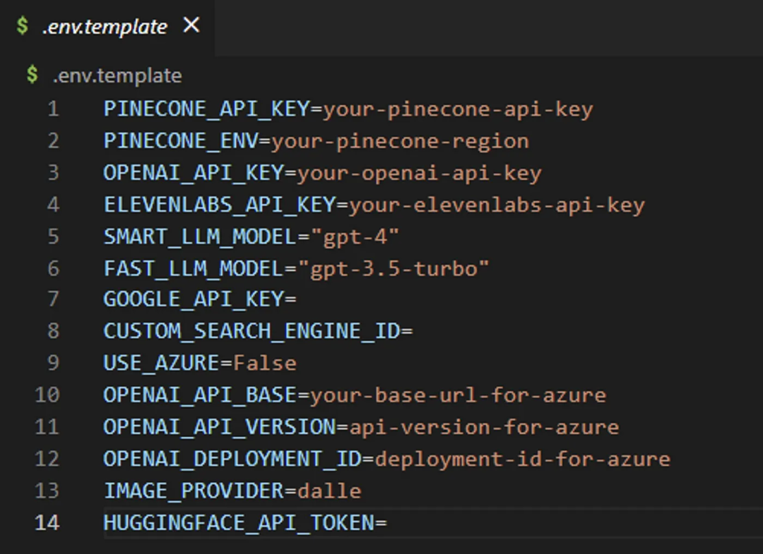 在 Auto-GPT 文件夹中,找到.env.template 文件并插入 OpenAI API 密钥。接着复制该文件并重命名为.env。