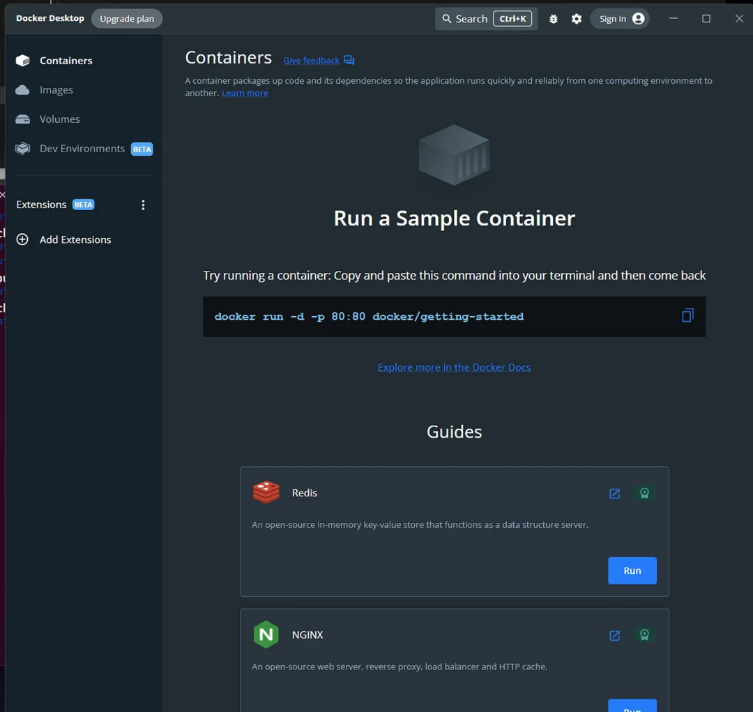 运行 Docker 桌面,不需要下载任何容器,只需保证程序处于激活状态。