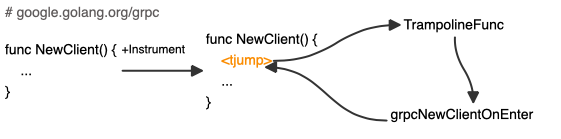 在代码注入阶段,工具会根据 rule.json 的配置,为目标函数(如NewClient)插入蹦床代码(Trampoline Code)。蹦床代码的主要作用是作为逻辑上的跳板来处理异常和填充上下文,最终它会跳转到用户自定义的grpcNewClientOnEnter和grpcNewClientOnExit函数,以完成监控数据的收集或服务流量的治理。由于蹦床代码是性能攸关的,我们在AST(抽象语法树)层面还会对蹦床代码做一系列优化,确保它的开销降到最低,关于优化部分感兴趣的读者可以访问项目源码,这里不再赘述。