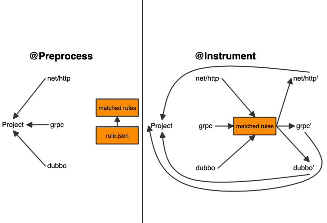 在正常情况下,go build命令会经过六个主要步骤:源码分析、类型检查、语义分析、编译优化、代码生成和链接,来编译一个 Go 应用程序。然而,使用自动插桩工具后,在这些步骤之前会增加两个步骤:预处理(Preprocess)和代码注入(Instrument)。
