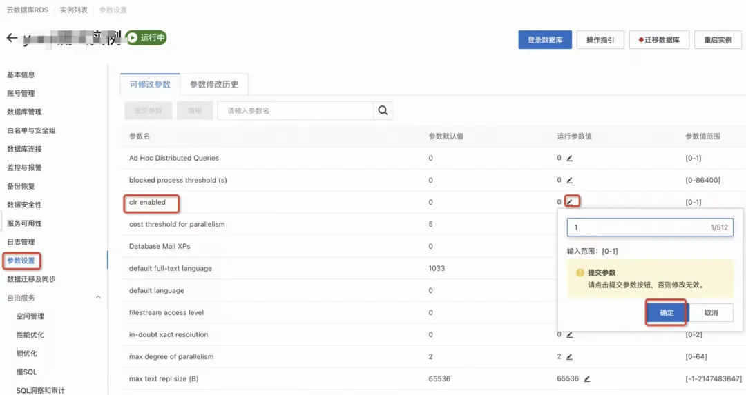 如果要部署CLR集成,首先需要配置 RDS SQL Server实例级参数“clr enabled”为1(该值默认为0)。登录RDS SQL Server控制台,进入参数设置页面,找到 clr enabled参数,即可启用CLR选项,如图1所示: