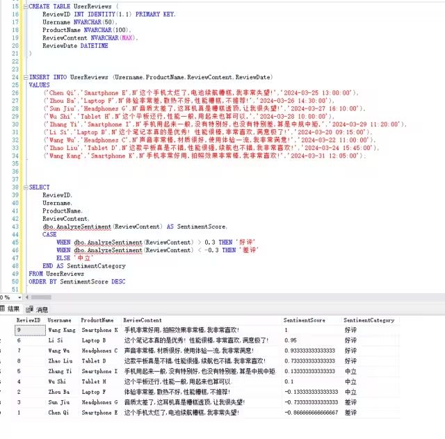 WHEN dbo.AnalyzeSentiment(ReviewContent) < -0.3 THEN ‘差评’