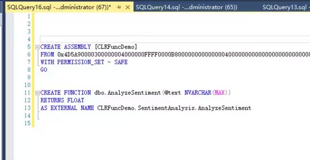 -- 创建程序集 CREATE ASSEMBLY [CLRFuncDemo] FROM 'E:\Backup\CLRFuncDemo.dll' WITH PERMISSION_SET = SAFE
