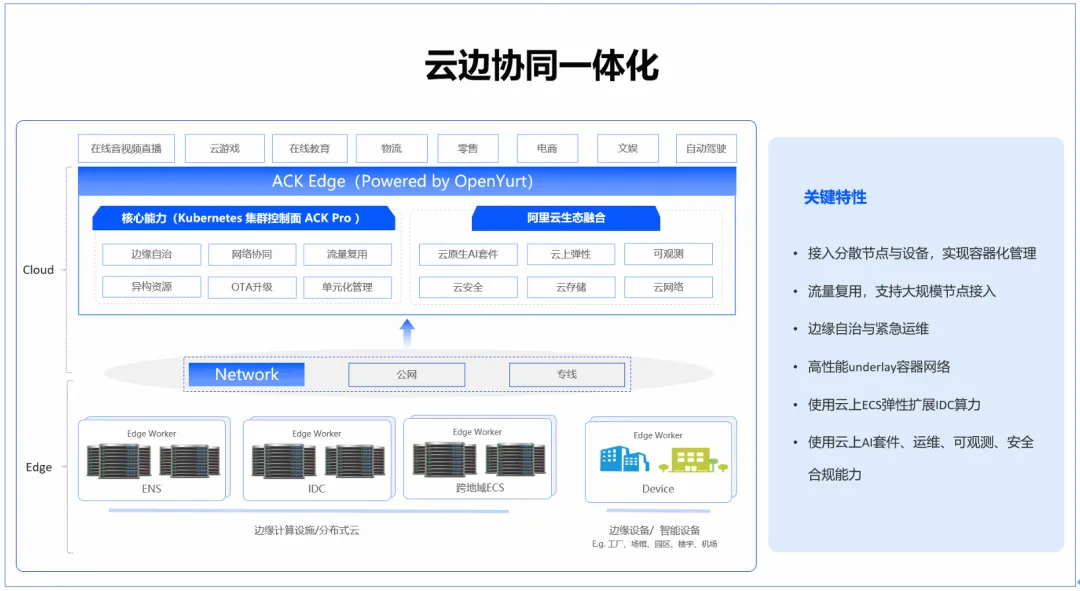 为推动云边协同核心技术自主可控和规模化应用,阿里云联合浙江大学等单位针对大规模云边协同场景中的边缘设备资源受限、云平台纳管性能瓶颈、云边协同计算实时性不足等技术挑战,研发了基于云原生的云边一体化平台,支持轻量级定制化容器,具备大规模边缘节点纳管、云边协同实时计算等关键优势。
