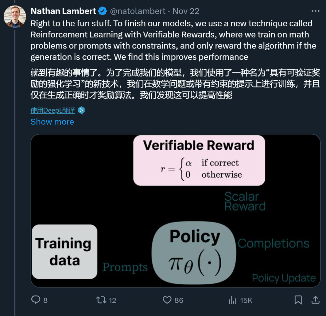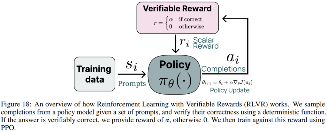 阶段四:具有可验证奖励的强化学习。Ai2 引入了一个新的基于强化学习的后训练阶段,该阶段通过可验证奖励(而不是传统 RLHF PPO 训练中常见的奖励模型)来训练模型。他们选择了结果可验证的任务,例如数学问题,并且只有当模型的生成被验证为正确时才提供奖励。然后,他们基于这些奖励进行强化学习训练。