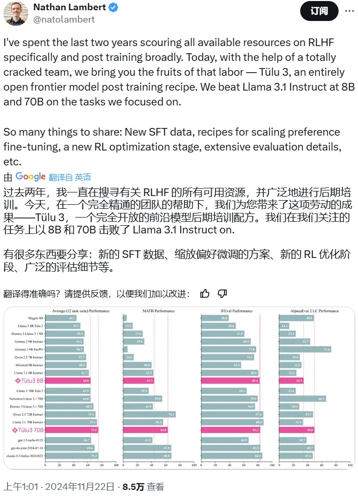 艾伦人工智能研究所推出的Tülu 3超越Llama 3.1,采用公开的后训练方法,模型性能备受瞩目。