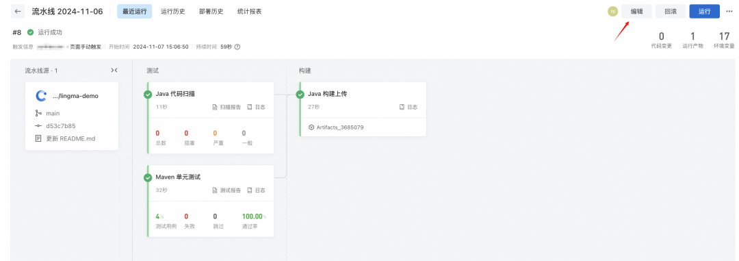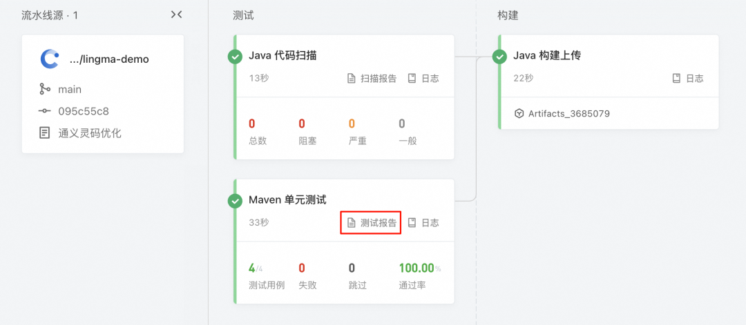 3. 流水线运行完毕后,可以看到当前的Java 代码扫描漏洞数量为0。
