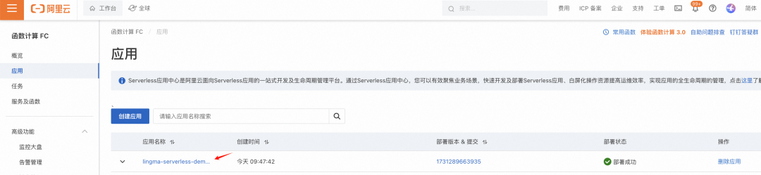 1. 打开函数计算应用列表,找到之前创建的应用,点击应用名称进入应用详情。
