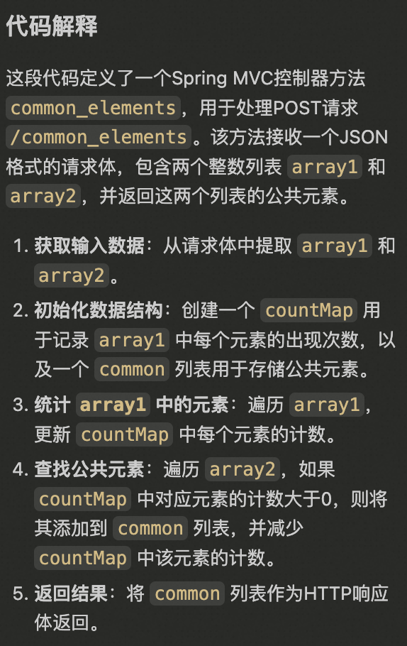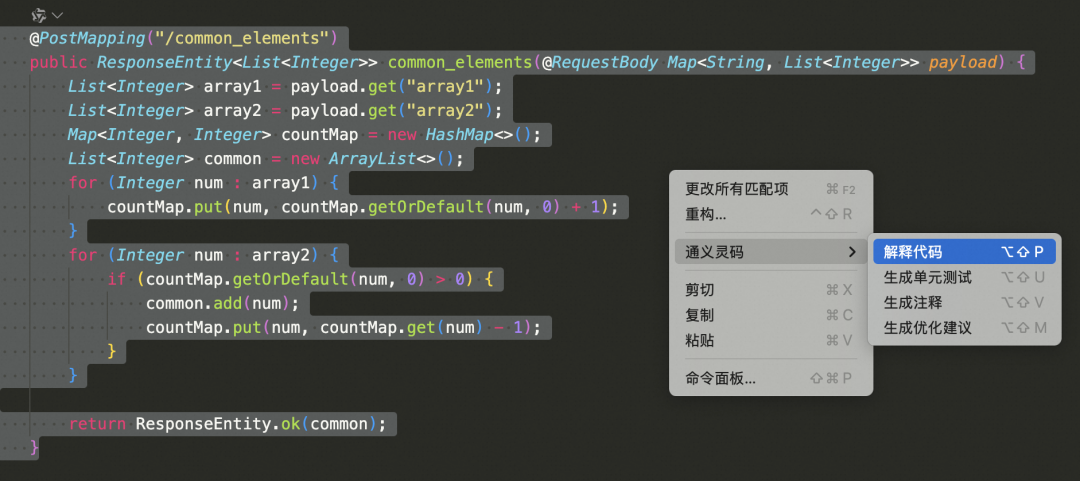 2. 选中common_elements函数的代码,右击选择通义灵码 > 解释代码。
