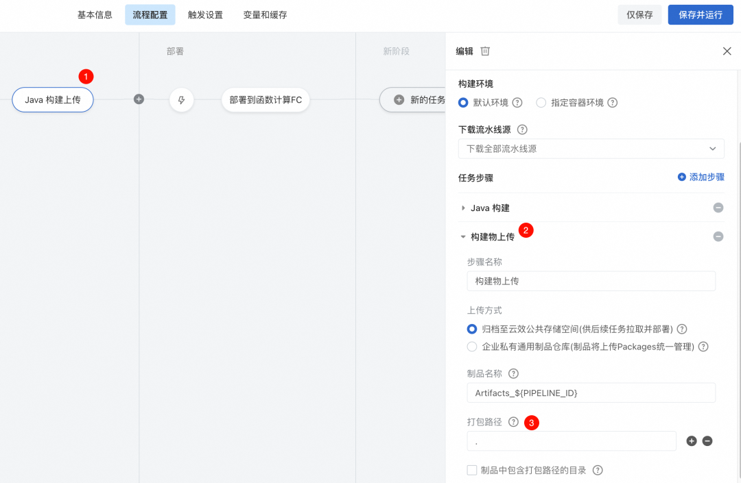 3. 点击Java构建上传,在弹窗中找到构建物上传,修改打包路径为“.”。修改完毕后点右上角关闭编辑页面。