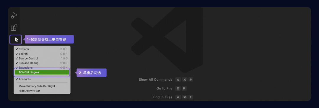 Tips:如果安装后在侧边导航上找不到通义灵码入口,可鼠标聚焦在侧边导航后右键查看,勾选通义灵码后即可将插件入口配置在侧边导航上。