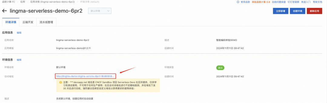 2. 在环境信息中找到访问域名,点击域名。