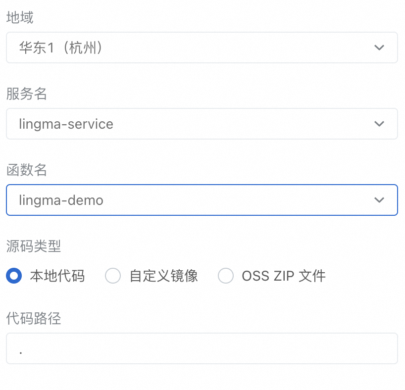 地域选择华东1(杭州),服务名选择“lingma-service”,函数名选择“lingma-demo”,源码类型选择本地代码,代码路径输入“.”。