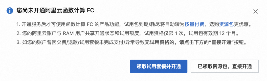 1. 开通函数计算:根据页面提示单击领取试用套餐并开通,然后单击立即购买即可自动开通服务。