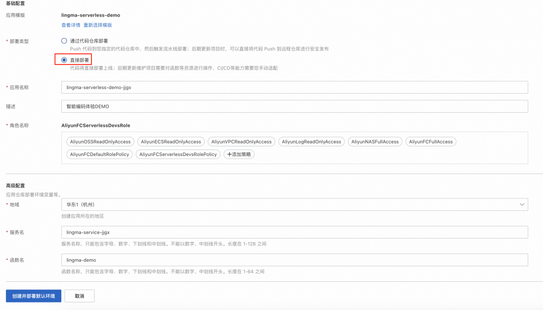 2. 点击模板链接,打开我们提供的函数计算应用模板,选择直接部署,其余配置项可以不做修改,点击创建并部署默认环境。