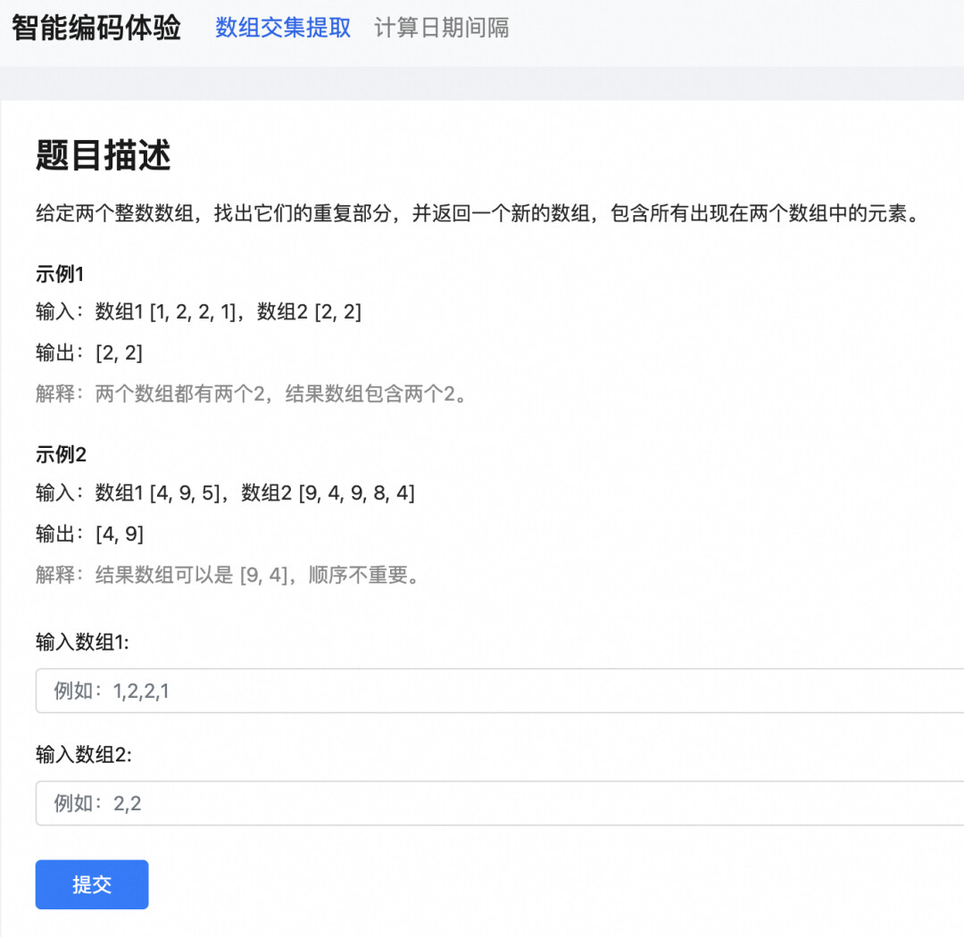 当前项目是一个提供算法题实现的在线网页,其中包括了两道具体的算法题目:“数组交集提取”以及“计算日期间隔”。“数组交集提取”代码已经完全实现,而“计算日期间隔”则仅仅完成了前端页面的设计,其后端处理逻辑还有待开发。