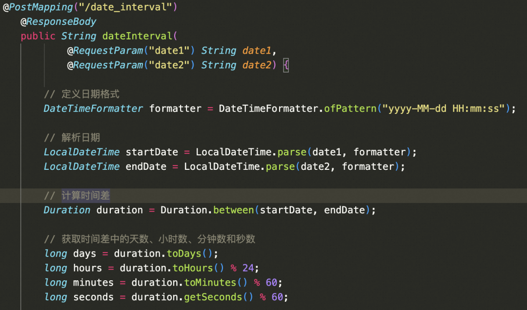 为进一步提升开发效率和代码质量,可以利用通义灵码对现有代码进行深入解析,并在此基础上生成新的代码片段和注释。特别是针对“计算日期间隔”这一尚未完成的功能,通义灵码将帮助我们快速实现后端处理逻辑。此外,通义灵码还可以自动生成单元测试用例,确保代码的正确性和可靠性。