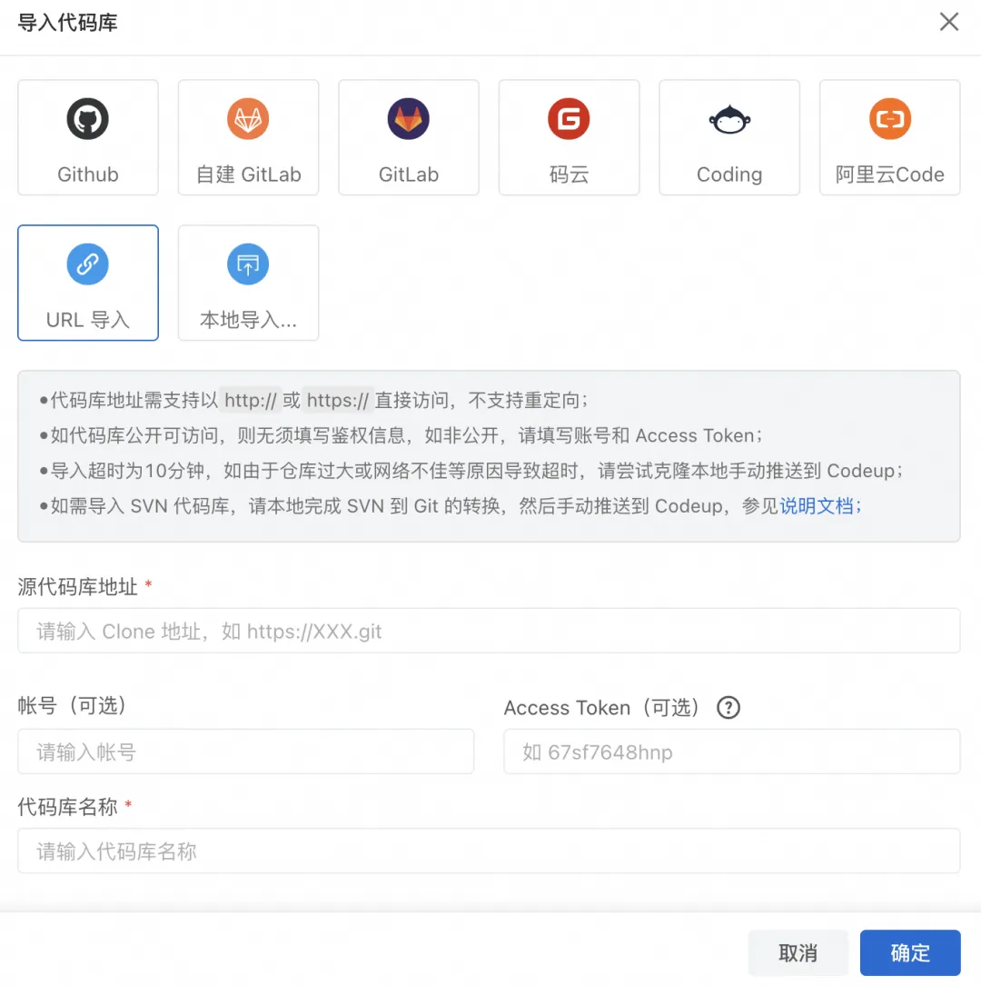 在导入代码库弹出框,选中URL导入,在源代码仓库地址填入