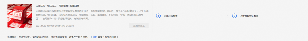 想必你通过阅读,已经学会如何部署了。现在邀请你来到阿里云开发者社区参加“AI编码,十倍提速,通义灵码引领研发新范式”活动,跟随教程完成任务一和任务二即可领取新年好运日历,每个工作日限量30个,上午10点更新奖品,领完即止。完成任务后需点击“领取奖品”按钮,前往社区“积分商城”中的“活动礼品兑换专区”,使用账户中的1积分进行兑换,有效期为15天。