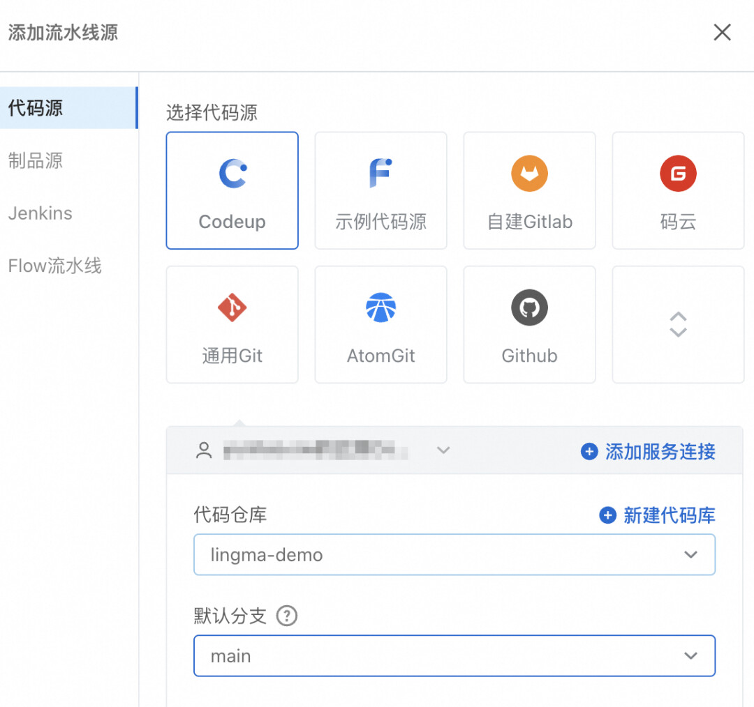 选择流水线源为代码源,选择Codeup。