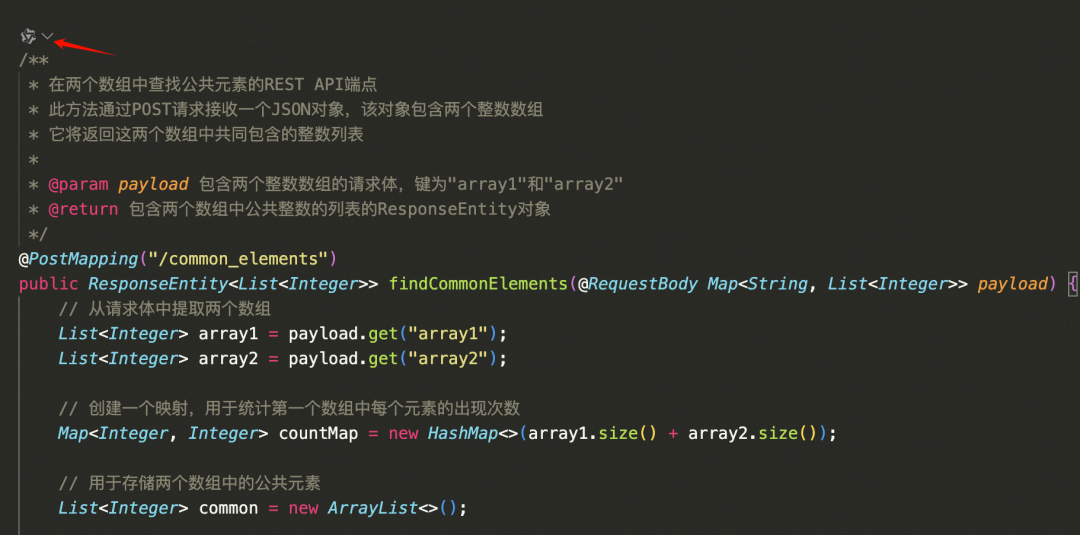1. 在common_elements函数(图中函数名优化为findCommonElements)定义的开头,点击通义灵码的小图标。