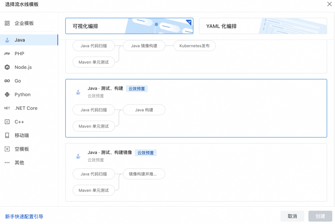 3. 在弹出面板中选择Java,顶部选择可视化编排,找到Java 测试、构建流水线模板,单击创建,进入流水线配置界面。