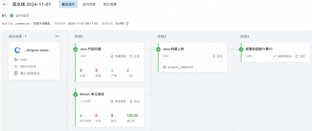 6. 如图所示,可以看到流水线已经运行成功,实现部署到函数计算FC。