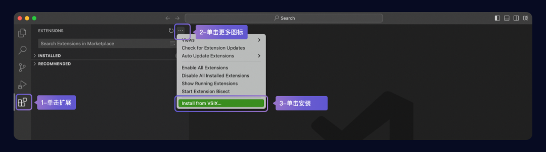 2. 下载完安装包后,打开 Visual Studio Code 后,单击扩展,单击更多按钮,在下拉菜单中单击从 VSIX 安装,选择下载的 VSIX 文件后安装;