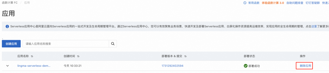 1. 手动删除函数计算应用:登录函数计算控制台,在左侧导航栏,单击应用。找到目标应用,单击右侧操作列的删除应用。