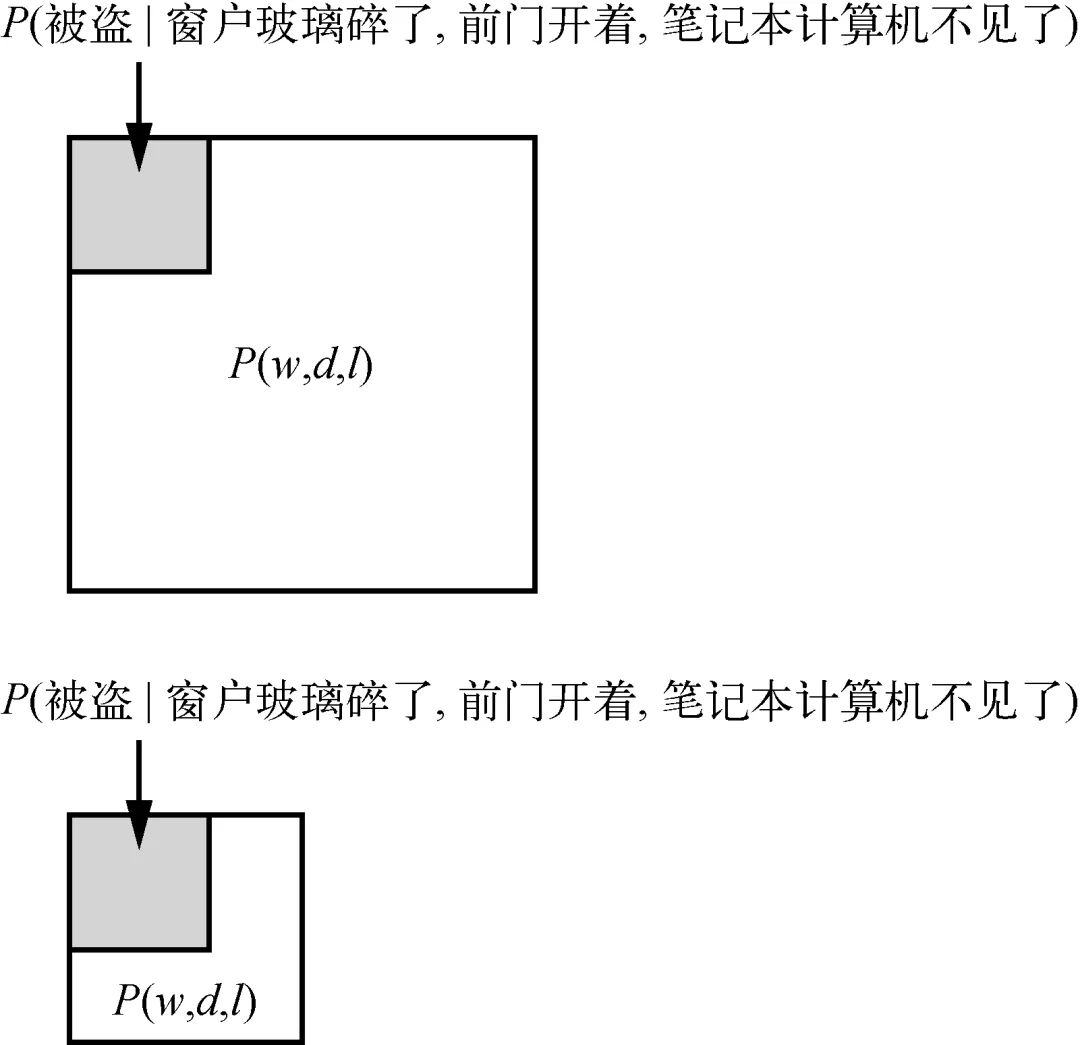 这里,我们问的是:“如果发生了盗窃,那么你看到当前这些数据的概率有多大?”你可以想象一下,被盗时以上所有数据并非都存在的任何场景。例如,聪明的小偷可能撬开了你家的锁,偷走笔记本计算机之后再把门锁上,这不需要打破窗户玻璃。或者他可能只打破了窗户玻璃,拿走笔记本计算机之后再通过窗户爬出来。从直觉上来说,我们看到的场景在盗窃现场很常见,所以我们假定,如果家里被盗,你回家后有