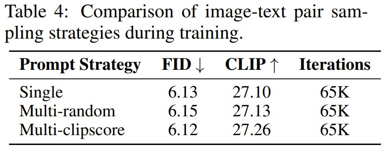 他们还提出了一种基于 Clip Score 的训练策略,即对于一张图像的多个描述,根据概率动态选择具有高 Clip Score 的描述。实验表明,这种方法可以提高训练收敛性和文本图像对齐程度。下表比较了训练期间不同的图像 - 文本对采样策略的效果。