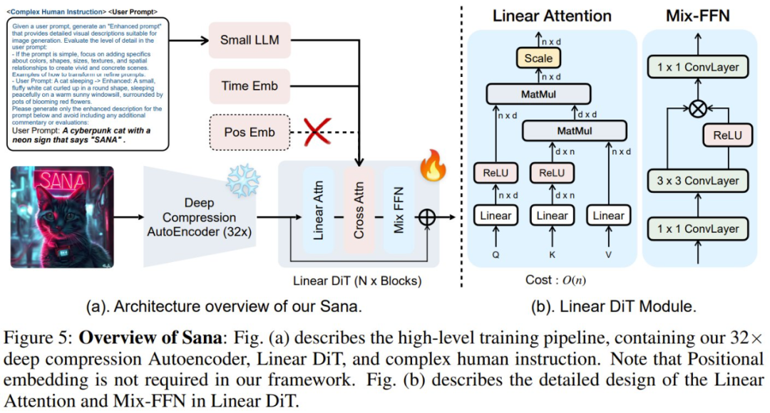 比如,LinFusion 中的线性注意力是蒸馏策略的一部分,而作者们把 SANA 作为一个基础生成模型,从头开始设计、训练。为了让线性注意力在所有层中代替原来的自注意力,他们做出了 Mix-FFN 解码器。