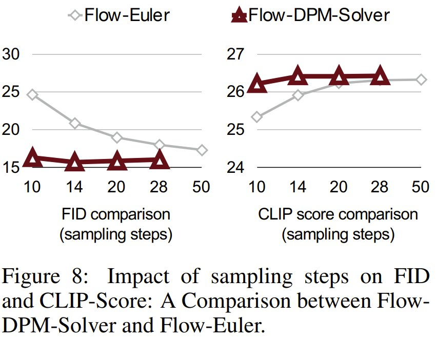 此外,他们也提出了一种 Flow-DPM-Solver,相比于广泛使用的 Flow-Euler-Solver,这种新的求解器可将推理采样步骤从 28-50 步减少到 14-20 步,同时还能实现更好的结果。见下图。