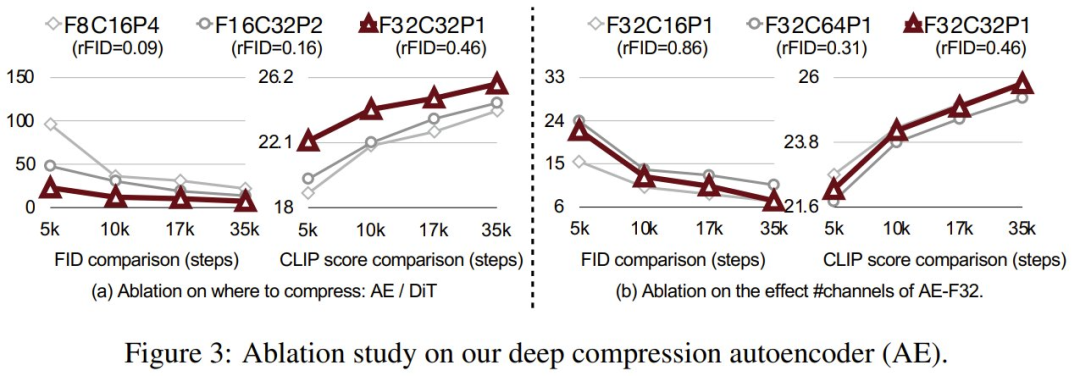 图 3 则展示了对新提出的深度压缩自动编码器进行消融实验的结果。该结果证明了新 AE 各项设计的重要性。