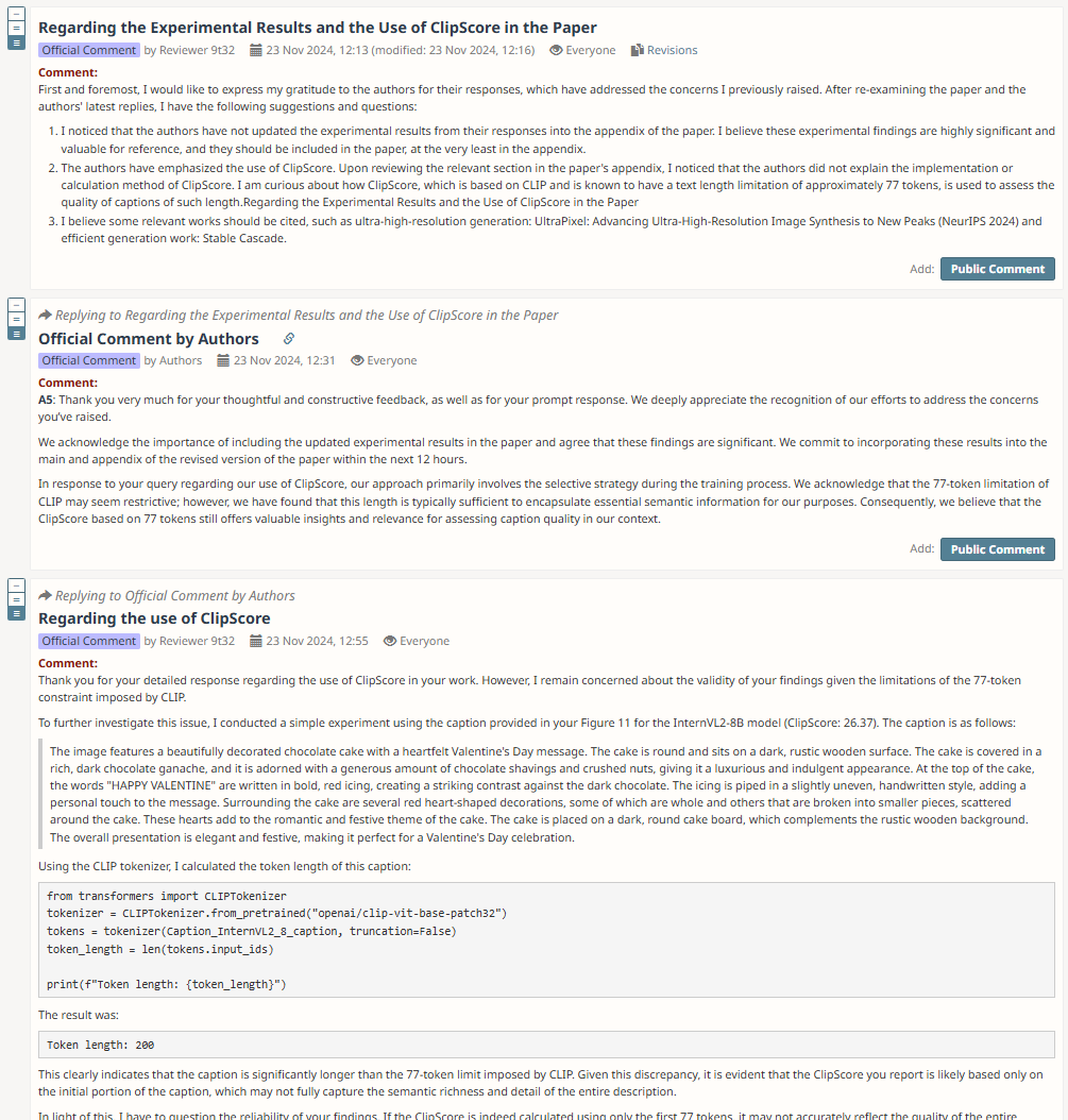 然后,作者对该审稿人的四个问题逐一进行了详细解答,并为论文内容做了进一步的补充。此后,又是关于 ClipScore 的几个来回讨论。