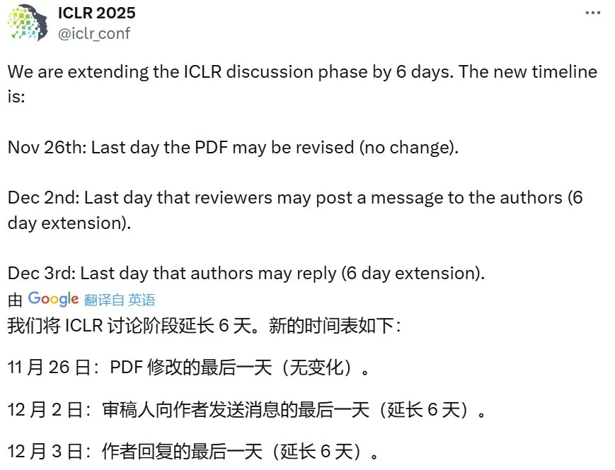 顺带一提,不知道是不是因为 ICLR 2025 审稿过程状况连连,官方此前还决定将论文讨论过程延长 6 天。