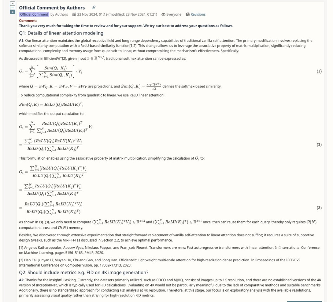 第二位审稿人更在意技术细节,他觉得 SANA 如何搭建的线性注意力模块还可以说得更清楚。