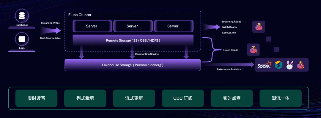 湖流一体:无缝集成 Lakehouse,并为 Lakehouse 提供实时数据层。这不仅为 Lakehouse 分析带来了低延时的数据,更为流存储带来了强大的分析能力。