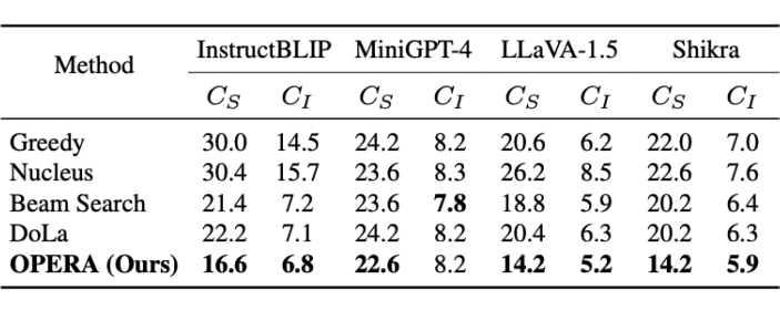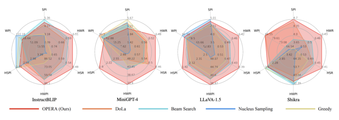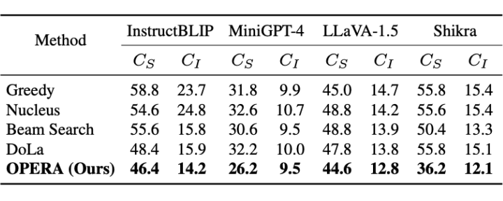 研究者们在 InstructBLIP,MiniGPT-4,LLaVA-1.5 以及 Shikra 等多种多模态大模型的 7B 模型上进行了测试,在不同维度上进行了统计验证。相比于之前的解码方法,所提出的 OPERA 解码方法在缓解幻觉上均表现出优越的性能。