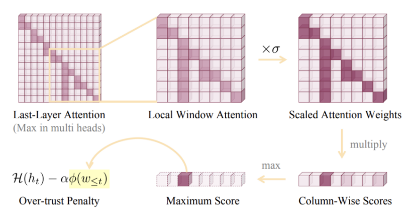 具体来说,他们首先在自注意力的权重图上划分出一个局部窗口,然后将这些权重在数值进行放大,同时使用列乘法得到一个得分向量,最后选择得分向量中的最大得分作为惩罚得分。这个惩罚得分越大说明出现生成句子中存在“过度信赖”的特征越明显,越可能出现幻觉。